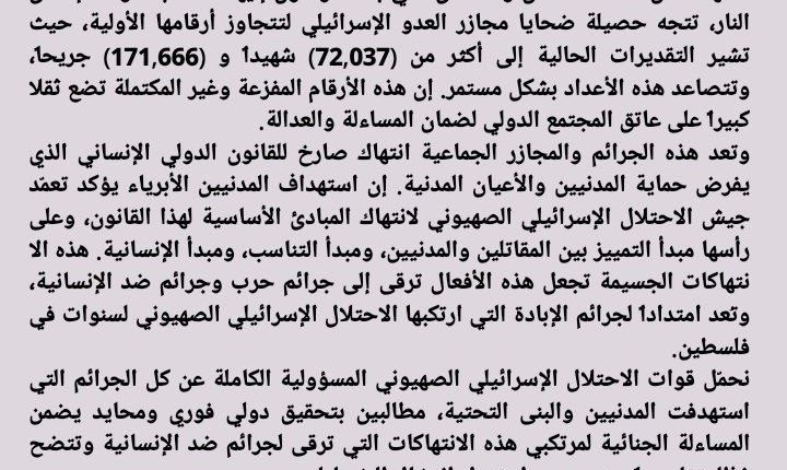 بيان إدانة حول الحصيلة المروعة لضحايا العدوان الإسرائيلي على قطاع غزة وتزايد أعدادهم (72,037) شهيداًو (171,666) جريحا