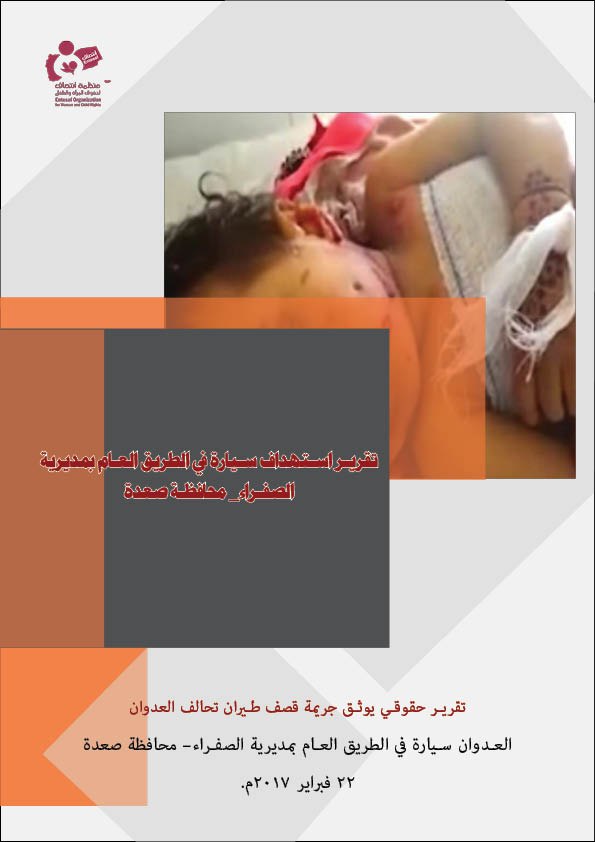 وثقت منظمة انتصاف لحقوق المرأة والطفل تقريراً حقوقياً بعنوان ” تقرير استهداف سيارة في الطريق العام بمديرية الصفراء بمحافظة صعدة” حيث تناول التقرير الجريمة التي ارتكبها طيران تحالف العدوان على سيارة في الطريق العام بمديرية الصفراء بمحافظة صعدة والتي راح ضحيتها مدنيين بينهم نساء و أطفال، وذلك بتاريخ 22 فبراير 2017م