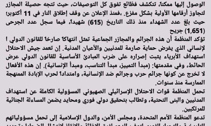 تحمل المنظمة قوات الاحتلال الإسرائيلي الصهيوني المسؤولية الكاملة عن استهداف المدنيين والبنى التحتية، وتطالب بتحقيق دولي فوري ومحايد يضمن المساءلة الجنائية للمرتكبين.