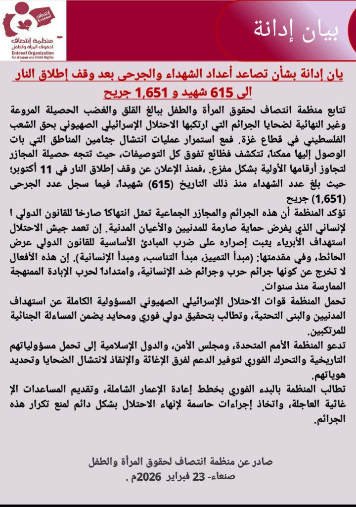 بيان إدانة بشأن تصاعد أعداد الشهداء والجرحى بعد وقف إطلاق النار الى 615 شهيد و 1,651 جريح