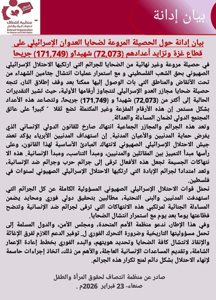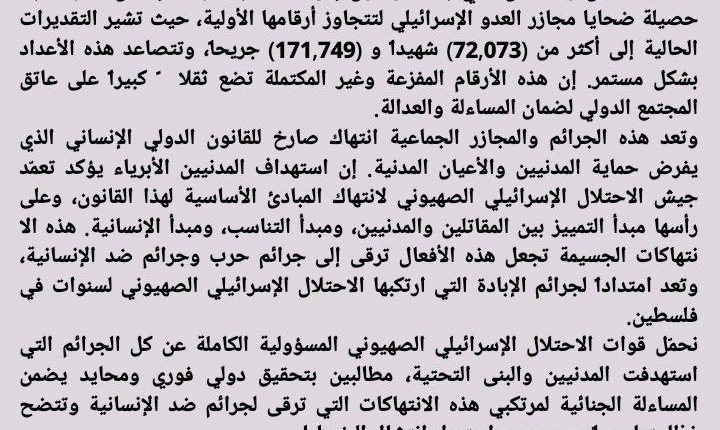بيان إدانة حول الحصيلة المروعة لضحايا العدوان الإسرائيلي على قطاع غزة وتزايد أعدادهم (72,073) شهيداًو (171,749) جريحا