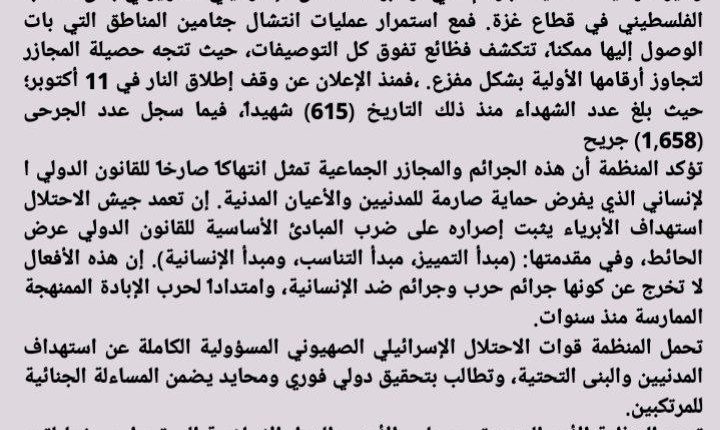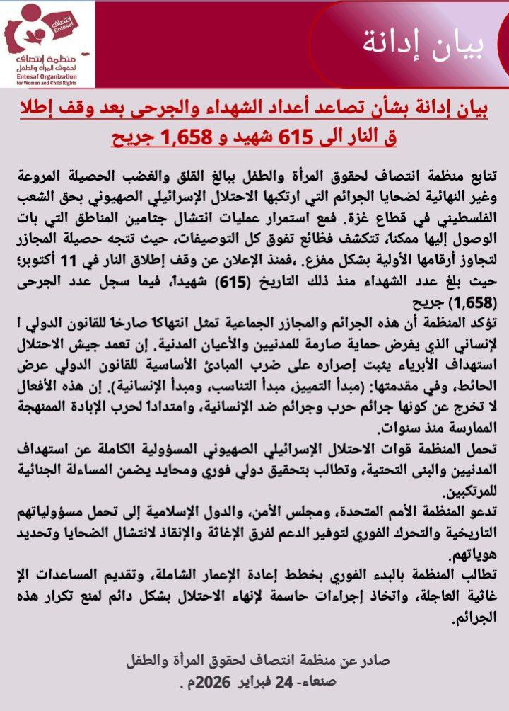 بيان إدانة بشأن تصاعد أعداد الشهداء والجرحى بعد وقف إطلاق النار الى 615 شهيد و 1,658 جريح