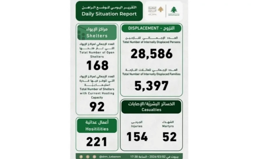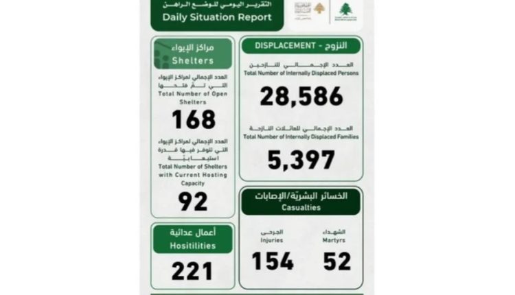 ونقلت “الوكالة الوطنية للإعلام” اللبنانية، عن وحدة إدارة الكوارث في السراي الحكومي في التقرير اليومي للوضع الراهن أنه “بسبب توسع العدوان الاسرائيلي على لبنان، فقد ارتفع عدد الشهداء إلى 52 شهيدا و 154 جريحا”.