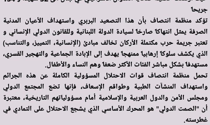 تؤكد منظمة انتصاف بأن هذا التصعيد البربري واستهداف الأعيان المدنية الصرفة يمثل انتهاكاً صارخاً لسيادة الدولة اللبنانية وللقانون الدولي الإنساني و تعتبر جريمة حرب مكتملة الأركان تخالف مبادئ (الإنسانية، التمييز، والتناسب) الذي يكشف سلوكاً إرهابياً ممنهجاً يهدف إلى الإبادة الجماعية والتهجير القسري، مستهدفاً بشكل مباشر الفئات الأكثر ضعفاً وهم النساء والأطفال.