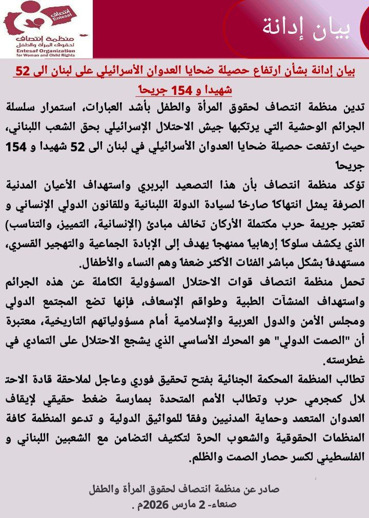تدين منظمة #انتصاف لحقوق المرأة والطفل بأشد العبارات، استمرار سلسلة الجرائم الوحشية التي يرتكبها جيش الاحتلال الإسرائيلي بحق الشعب اللبناني، حيث ارتفعت حصيلة ضحايا العدوان الأسرائيلي في لبنان الى 52 شهيدا و 154 جريحاً