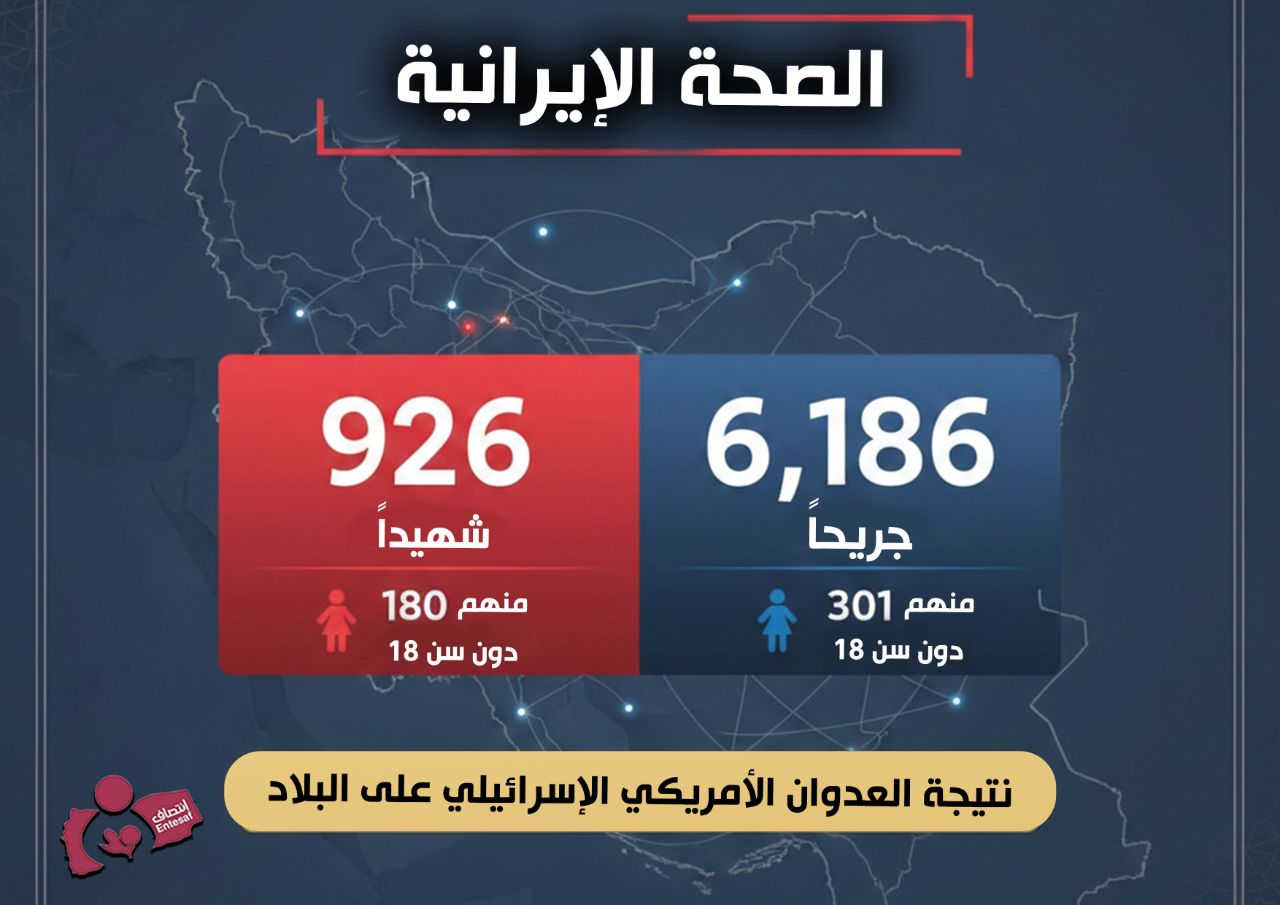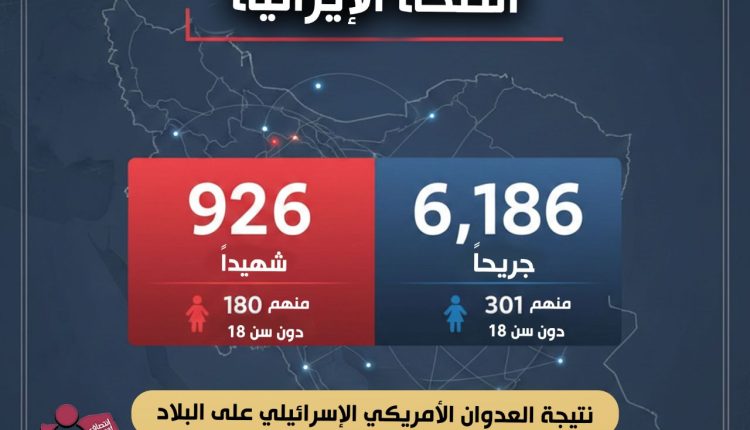 الصحة الإيرانية 926 شهيدا منهم 180 ما دون سن الـ 18 و6,186 جريحا بينهم 301 ما دون سن الـ 18 نتيجة العدوان الأمريكي الإسرائيلي على البلاد