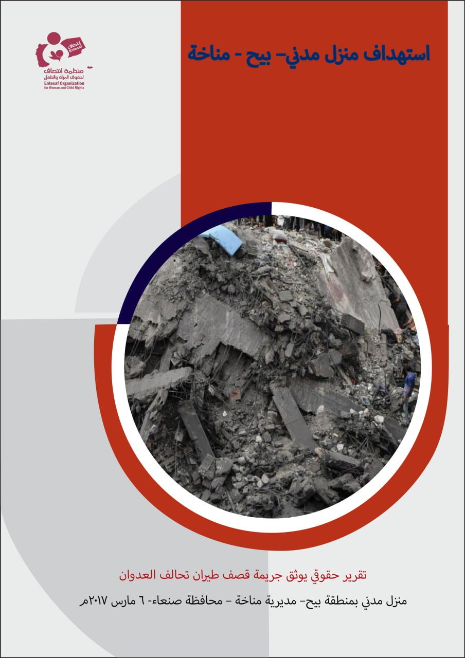 وثقت منظمة انتصاف لحقوق المرأة والطفل تقريراً حقوقياً بعنوان “تقرير استهداف منزل مدني – بيح – مناخة” حيث تناول التقرير جريمة قصف مدفعية تحالف العدوان على منزل مدني بمنطقة بيح بمديرية مناخة التابعة لمحافظة صنعاء والتي راح ضحيتها مدنيين بينهم نساء و أطفال، وذلك بتاريخ 6 مارس 2017م