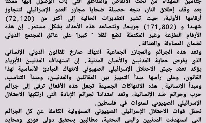 بيان إدانة حول الحصيلة المروعة لضحايا العدوان الإسرائيلي على قطاع غزة وتزايد أعدادهم (72,120) شهيداًو (171,802) جريحا