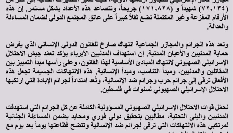 بيان إدانة حول الحصيلة المروعة لضحايا العدوان الإسرائيلي على قطاع غزة وتزايد أعدادهم (72,134) شهيداًو (171,828) جريحا