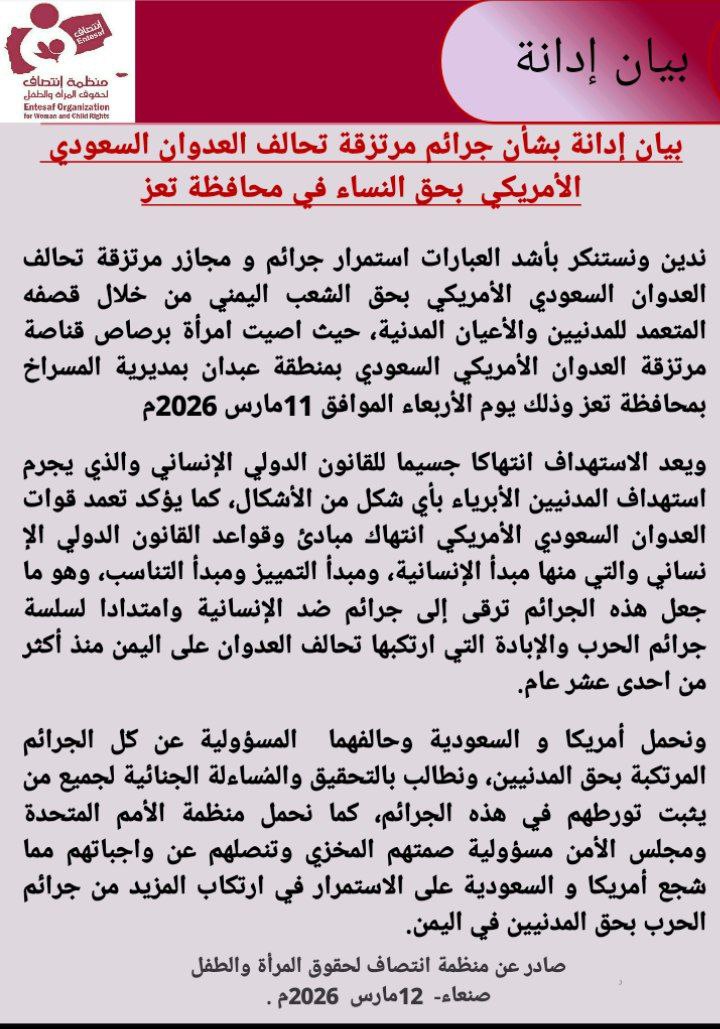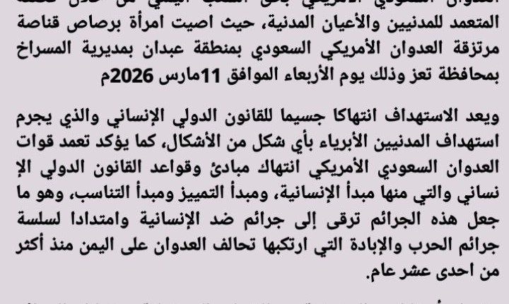 ندين ونستنكر بأشد العبارات استمرار جرائم و مجازر مرتزقة تحالف العدوان السعودي الأمريكي بحق الشعب اليمني من خلال قصفه المتعمد للمدنيين والأعيان المدنية، حيث اصيت امرأة برصاص قناصة مرتزقة العدوان الأمريكي السعودي بمنطقة عبدان بمديرية المسراخ بمحافظة تعز وذلك يوم الأربعاء الموافق 11مارس 2026م