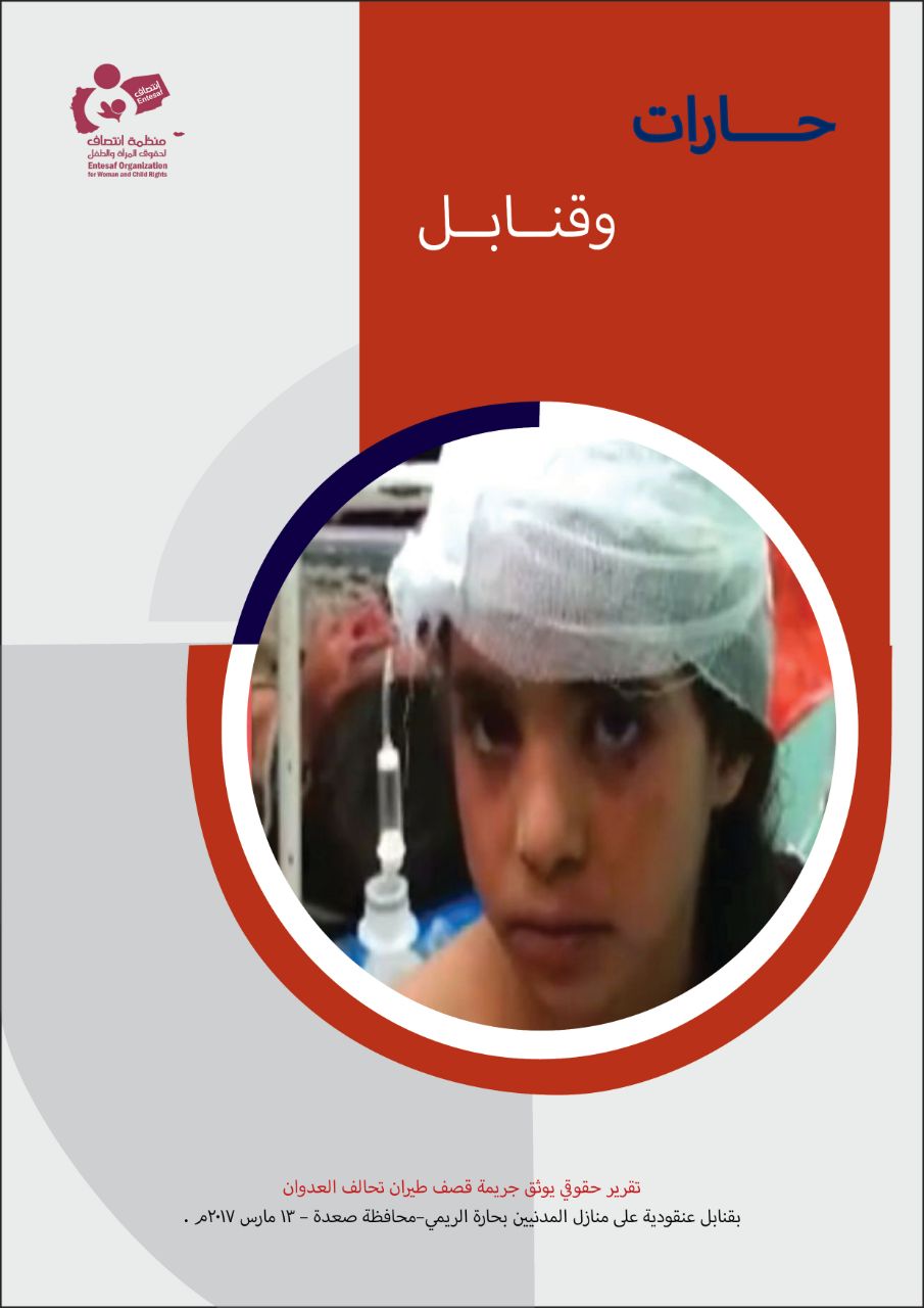 وثقت منظمة انتصاف لحقوق المرأة والطفل تقريراً حقوقياً بعنوان “حارات و قنابل” حيث تناول التقرير الجريمة التي ارتكبها طيران تحالف العدوان بقنابل عنقودية على منازل المدنيين بحارة الريمي بمحافظة صعدة والتي راح ضحيتها مدنيين بينهم نساء و أطفال، وذلك بتاريخ 13 مارس 2017م