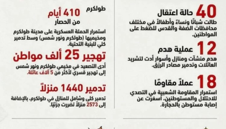 ولفت إلى أن الحملة العسكرية الصهيونية ما تزال مستمرة على مخيمات جنين وطولكرم، مع تهجير أكثر من 25 ألف مواطن فلسطيني وتدمير 1440 منزلًا كليًا، و2573 منزلًا جزئيًا.