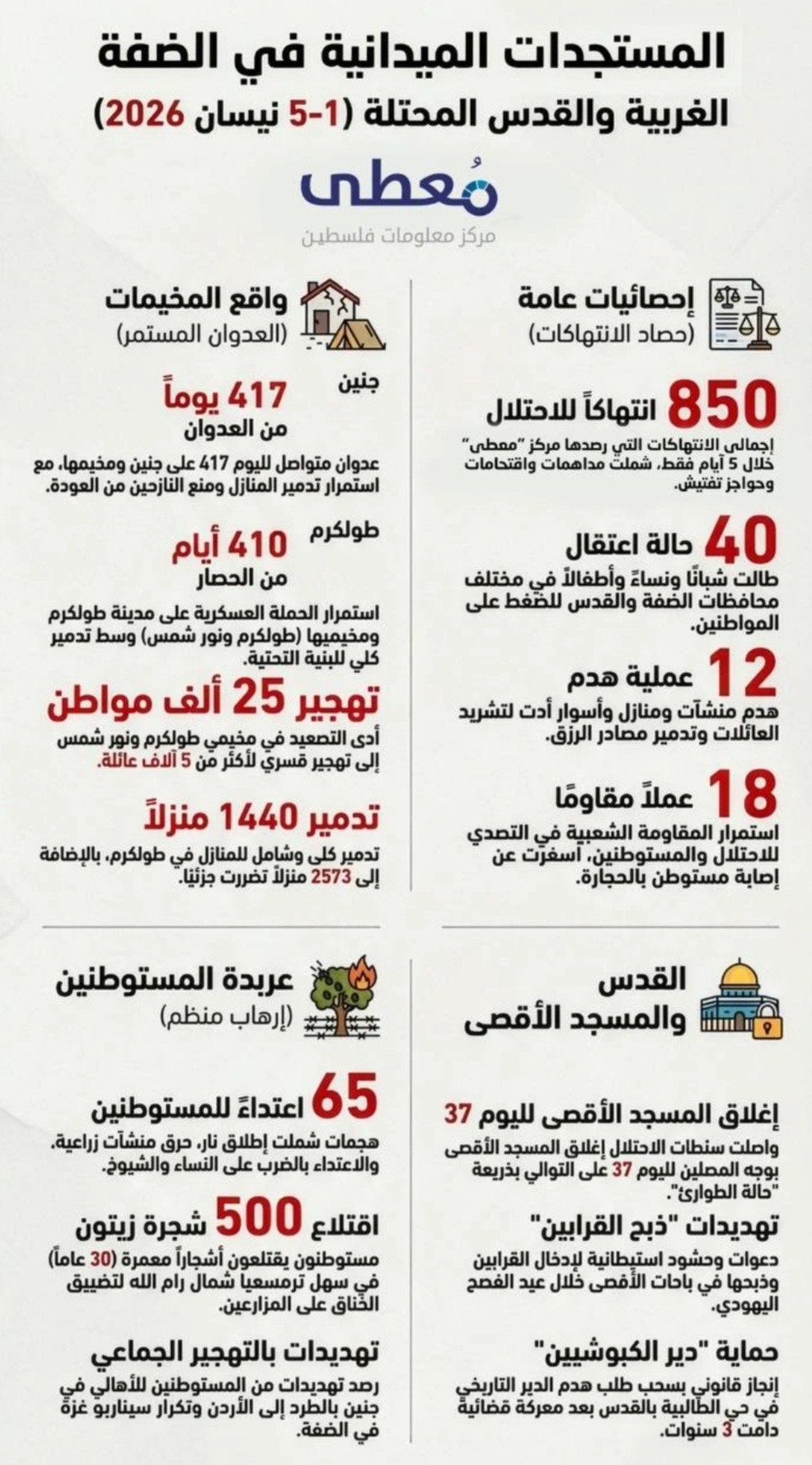 وفي القدس المحتلة، ذكر “معطى” أن العدو الإسرائيلي واصل إغلاق المسجد الأقصى المبارك لليوم الـ37، وسط دعوات استيطانية لإدخال القرابين وذبحها خلال ما يسمى “عيد الفصح” اليهودي، فيما تم حماية دير الكبوشين التاريخي بعد معركة قضائية استمرت ثلاث سنوات.