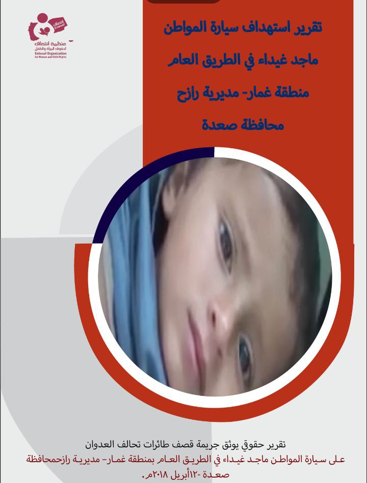 وثقت منظمة انتصاف لحقوق المرأة والطفل تقريراً حقوقياً بعنوان ” تقرير استهداف سيارة المواطن ماجد غيداء في الطريق العام بمنطقة غمار بمديرية رازح محافظة صعدة” حيث تناول التقرير جريمة قصف طيران تحالف العدوان على سيارة المواطن ماجد غيداء في الطريق العام بمنطقة غمار بمديرية رازح التابعة بمحافظة صعدة والتي راح ضحيتها مدنيين بينهم نساء و أطفال، وذلك بتاريخ 12 أبريل 2018م
