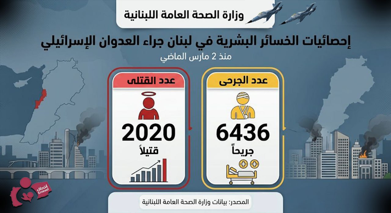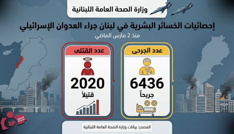 إحصائيات الخسائر البشرية في لبنان بلغت إلى 2020 قتيل و 6436 جريح جراء العدوان الإسرائيلي في 2 مارس الماضي