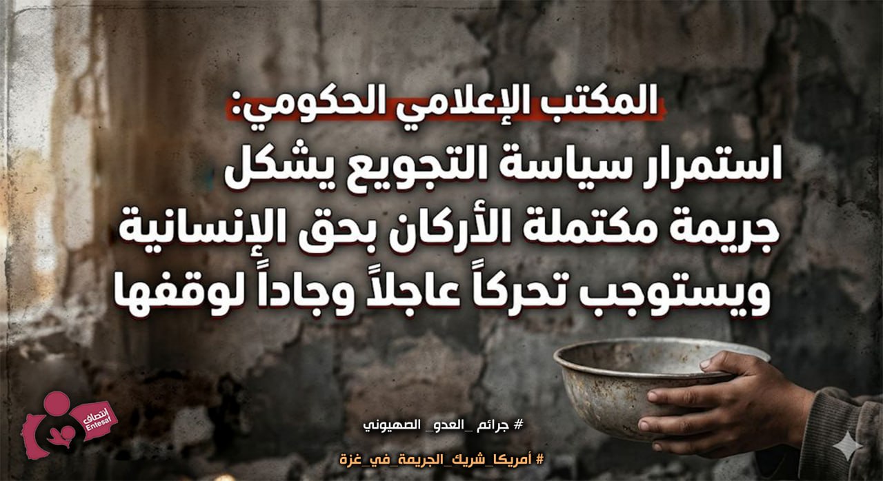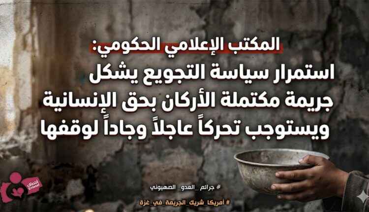 المكتب الإعلامي الحكومي استمرار سياسية التجويع يشكل جريمة مكتملة الأركان بحق الإنسانية و يستوجب تحركاً عاجلاً و جاداً لوقفها