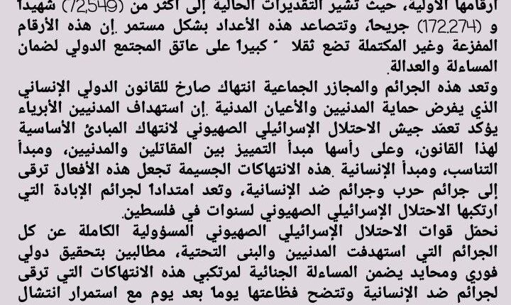 بيان إدانة حول الحصيلة المروعة لضحايا العدوان الإسرائيلي على قطاع غزة وتزايد أعدادهم (72,549) شهيداًو (172.274) جريحا