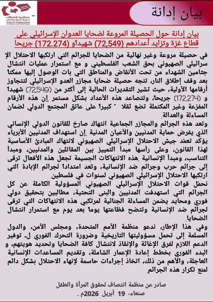 صادر عن منظمة انتصاف لحقوق المرأة والطفل صنعاء