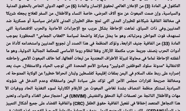 حيث تعمد المبعوث الأممي في إحاطته تجاهل استمرار الحصار المفروض على مطار صنعاء الدولي والموانئ اليمنية، وهو ما يعد انتهاكاً صارخاً لـ “حق الحياة” المكفول في المادة (3) من الإعلان العالمي لحقوق الإنسان والمادة (6) من العهد الدولي الخاص بالحقوق المدنية والسياسية، وإن صمت المبعوث عن منع آلاف المرضى، خاصة النساء والأطفال، من السفر للعلاج يجعله شريكاً في مخالفة اتفاقية شيكاغو للطيران المدني التي تمنع حظر الطيران المدني لأغراض سياسية أو عسكرية ضد المدنيين.