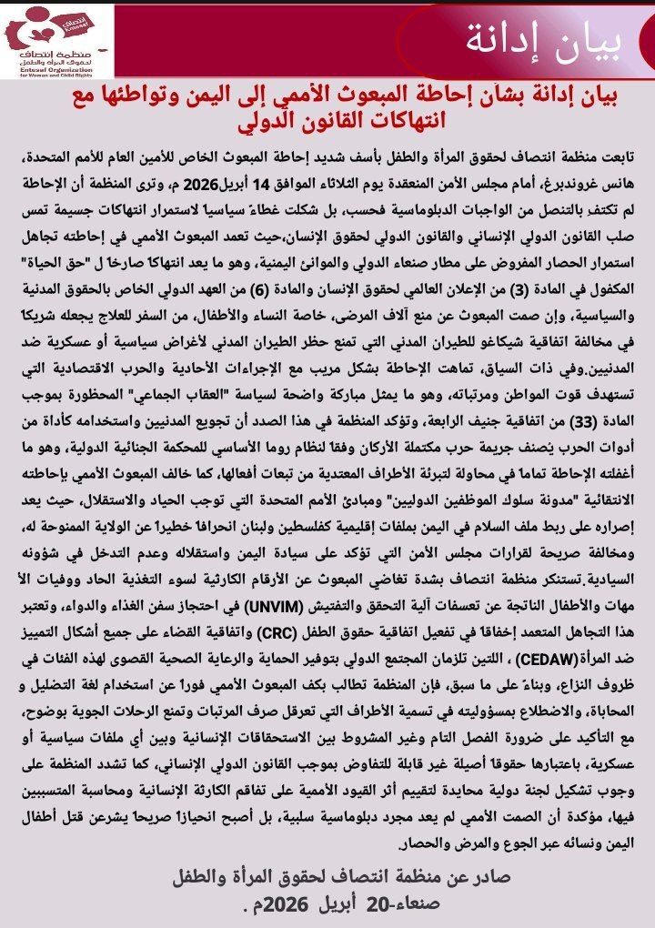 تستنكر منظمة انتصاف بشدة تغاضي المبعوث عن الأرقام الكارثية لسوء التغذية الحاد ووفيات الأمهات والأطفال الناتجة عن تعسفات آلية التحقق والتفتيش (UNVIM) في احتجاز سفن الغذاء والدواء، وتعتبر هذا التجاهل المتعمد إخفاقاً في تفعيل اتفاقية حقوق الطفل (CRC) واتفاقية القضاء على جميع أشكال التمييز ضد المرأة (CEDAW)، اللتين تلزمان المجتمع الدولي بتوفير الحماية والرعاية الصحية القصوى لهذه الفئات في ظروف النزاع،