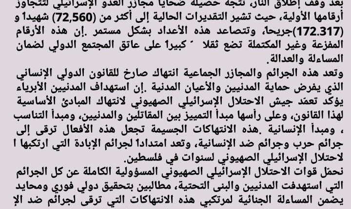 بيان إدانة حول الحصيلة المروعة لضحايا العدوان الإسرائيلي على قطاع غزة وتزايد أعدادهم (72,560) شهيداًو (172.317) جريحا