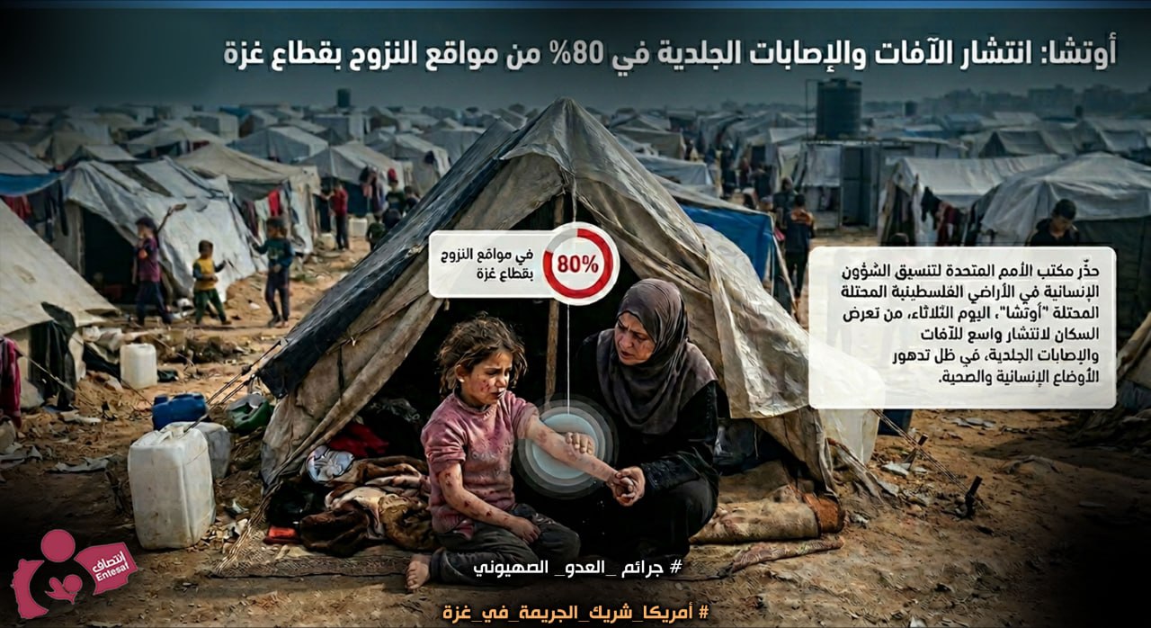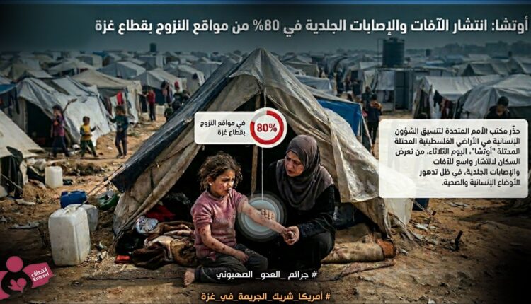 حذّر مكتب الأمم المتحدة لتنسيق الشؤون الإنسانية في الأراضي الفلسطينية المحتلة “أوتشا”، اليوم الثلاثاء، من تعرض السكان في 80% من مواقع النزوح بقطاع غزة لانتشار واسع للآفات والإصابات الجلدية، في ظل تدهور الأوضاع الإنسانية والصحية.