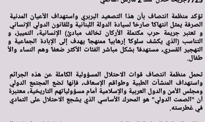 تؤكد منظمة انتصاف بأن هذا التصعيد البربري واستهداف الأعيان المدنية الصرفة يمثل انتهاكاً صارخاً لسيادة الدولة اللبنانية وللقانون الدولي الإنساني و تعتبر جريمة حرب مكتملة الأركان تخالف مبادئ (الإنسانية، التمييز، والتناسب) الذي يكشف سلوكاً إرهابياً ممنهجاً يهدف إلى الإبادة الجماعية والتهجير القسري، مستهدفاً بشكل مباشر الفئات الأكثر ضعفاً وهم النساء والأطفال.