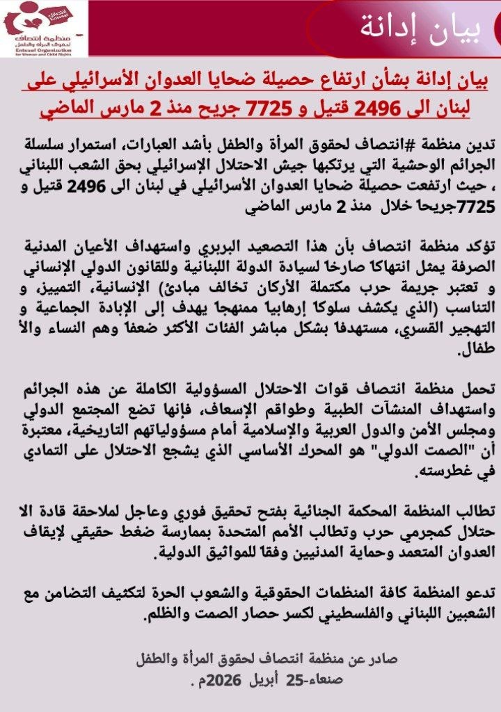 تدين منظمة #انتصاف لحقوق المرأة والطفل بأشد العبارات، استمرار سلسلة الجرائم الوحشية التي يرتكبها جيش الاحتلال الإسرائيلي بحق الشعب اللبناني، حيث ارتفعت حصيلة ضحايا العدوان الأسرائيلي في لبنان الى 2496 قتيل و 7725 جريحاً خلال منذ 2 مارس الماضي