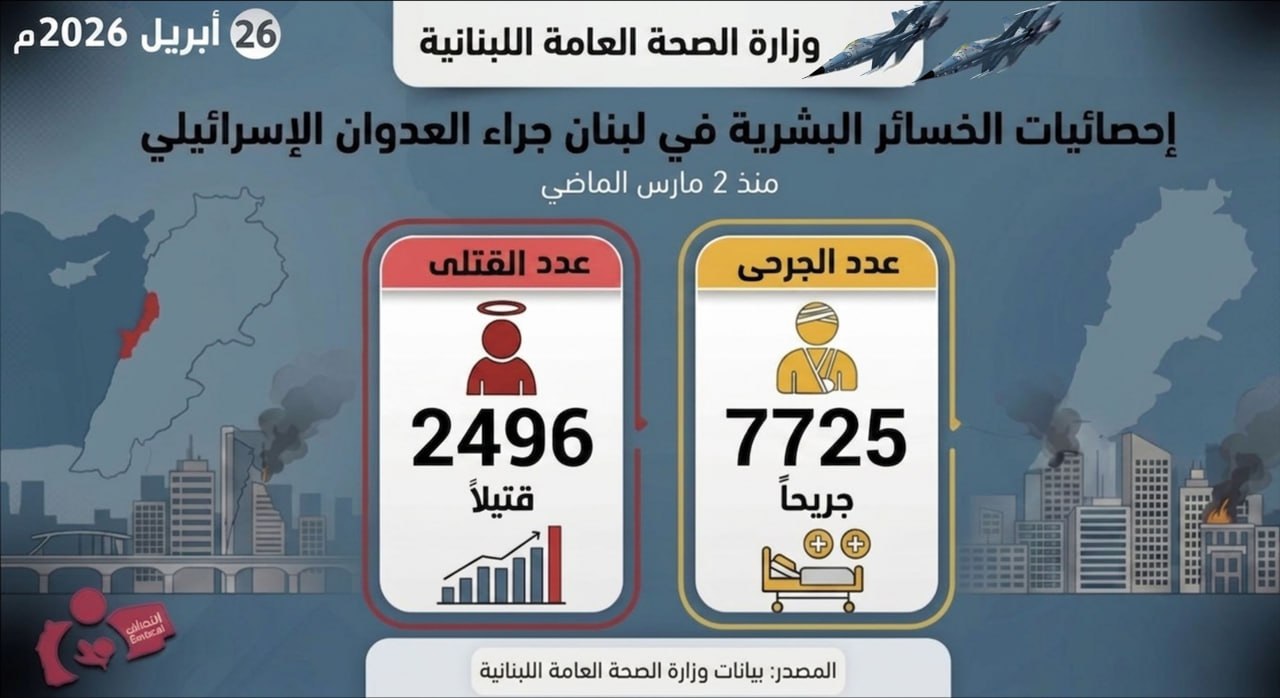 إحصائيات الخسائر البشرية في لبنان بلغت إلى 2496 قتيل و 7725 جريح جراء العدوان الإسرائيلي في 2 مارس الماضي