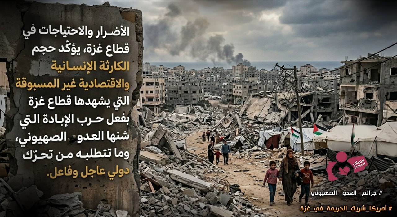” الأضرار والاحتياجات في قطاع غزة، يؤكّد حجم الكارثة الإنسانية والاقتصادية غير المسبوقة التي يشهدها قطاع غزة بفعل حرب الإبادة التي شنها العدو الصهيوني، وما تتطلبه من تحرّك دولي عاجل وفاعل.