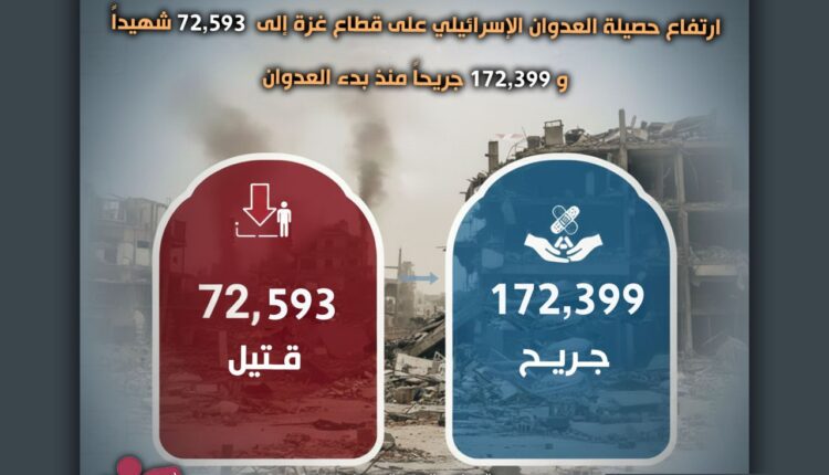 ارتفعت حصيلة العدوان الأسرائيلي على قطاع غزة الى 72,593 قتيل و 172.399 جريحاً