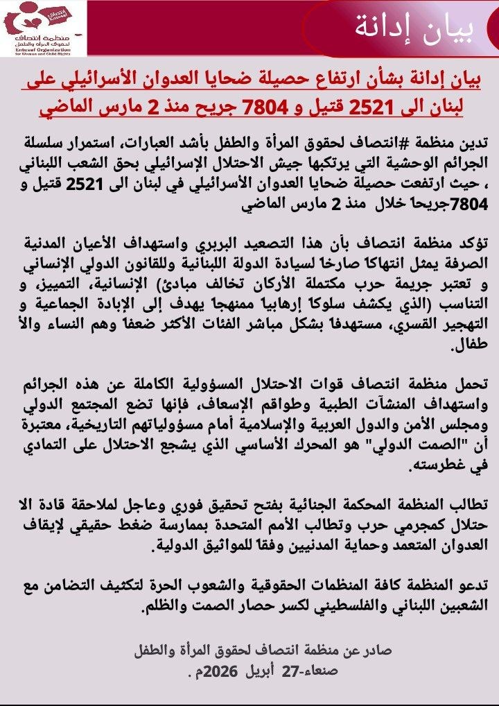 تدين منظمة #انتصاف لحقوق المرأة والطفل بأشد العبارات، استمرار سلسلة الجرائم الوحشية التي يرتكبها جيش الاحتلال الإسرائيلي بحق الشعب اللبناني، حيث ارتفعت حصيلة ضحايا العدوان الأسرائيلي في لبنان الى 2521 قتيل و 7804 جريحاً خلال منذ 2 مارس الماضي