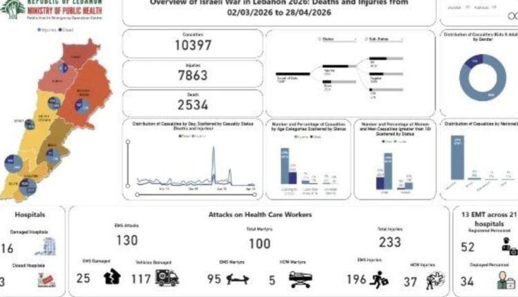 ارتفعت الحصيلة التراكمية لضحايا العدوان الإسرائيلي على لبنان، اليوم الثلاثاء، إلى 2534 شهيداً و7863 جريحاً، منذ بداية التصعيد الصهيوني الأخير في الثاني من مارس الماضي.