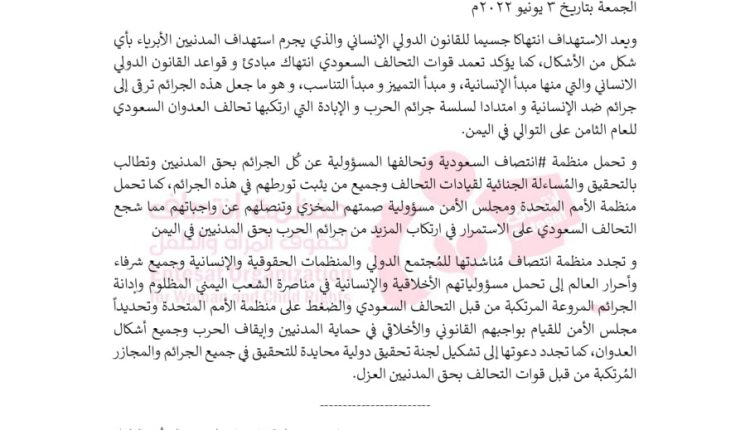 بيان إدانة منظمة #انتصاف لحقوق المرأة و الطفل بشأن استمرار جرائم دول تحالف العدوان السعودي بحق الأطفال بمحافظة #لحج