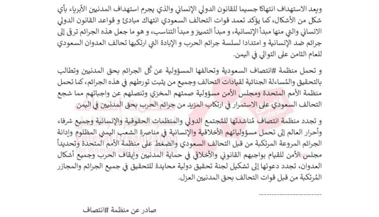 و تجدد منظمة انتصاف مُناشدتها للمُجتمع الدولي والمنظمات الحقوقية والإنسانية وجميع شرفاء وأحرار العالم إلى تحمل مسؤولياتهم الأخلاقية والإنسانية في مناصرة الشعب اليمني المظلوم وإدانة الجرائم المروعة المرتكبة من قبل التحالف السعودي والضغط على منظمة الأمم المتحدة وتحديداً مجلس الأمن للقيام بواجبهم القانوني والأخلاقي في حماية المدنيين وإيقاف الحرب وجميع أشكال العدوان، تجدد دعوتها إلى تشكيل لجنة تحقيق دولية محايدة للتحقيق في جميع الجرائم والمجازر المُرتكبة من قبل قوات التحالف بحق المدنيين العزل.