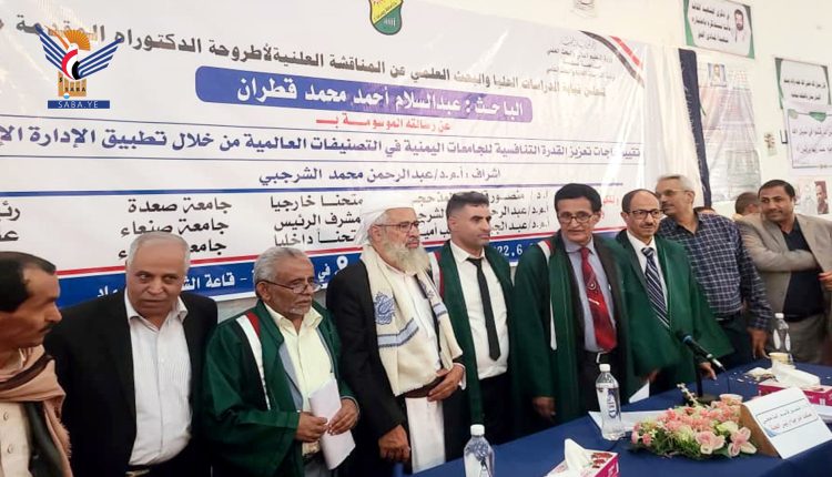حصل الباحث عبد السلام أحمد محمد قطران اليوم، على درجة الدكتوراه بامتياز في الإدارة والتخطيط من كلية التربية- بجامعة صنعاء عن رسالته الموسومة بـ” تقييم حاجات تعزيز القدرة التنافسية للجامعات اليمنية في التصنيفات العالمية من خلال تطبيق الإدارة الاستراتيجية “.