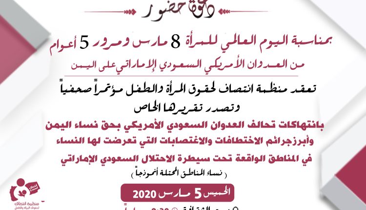 Image منظمة انتصاف لحقوق المراءه والطفل تعقد مؤتمراً صحفيا وتصدر تقريرها الخاص في نوفمبر 6, 2021 0 مشاركة منظمة انتصاف – انفوجرافيك منظمة انتصافموتمر صحفي 0 مشاركة FacebookTwitterGoogle+ReddItWhatsAppPinterestالبريد الإلكتروني