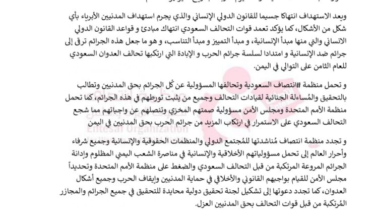 و تجدد منظمة انتصاف مُناشدتها للمُجتمع الدولي والمنظمات الحقوقية والإنسانية وجميع شرفاء وأحرار العالم إلى تحمل مسؤولياتهم الأخلاقية والإنسانية في مناصرة الشعب اليمني المظلوم وإدانة الجرائم المروعة المرتكبة من قبل التحالف السعودي والضغط على منظمة الأمم المتحدة وتحديداً مجلس الأمن للقيام بواجبهم القانوني والأخلاقي في حماية المدنيين وإيقاف الحرب وجميع أشكال العدوان، كما تجدد دعوتها إلى تشكيل لجنة تحقيق دولية محايدة للتحقيق في جميع الجرائم والمجازر المُرتكبة من قبل قوات التحالف بحق المدنيين العزل.