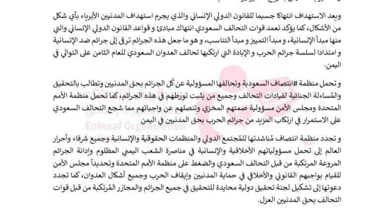 و تجدد منظمة انتصاف مُناشدتها للمُجتمع الدولي والمنظمات الحقوقية والإنسانية وجميع شرفاء وأحرار العالم إلى تحمل مسؤولياتهم الأخلاقية والإنسانية في مناصرة الشعب اليمني المظلوم وإدانة الجرائم المروعة المرتكبة من قبل التحالف السعودي والضغط على منظمة الأمم المتحدة وتحديداً مجلس الأمن للقيام بواجبهم القانوني والأخلاقي في حماية المدنيين وإيقاف الحرب وجميع أشكال العدوان، كما تجدد دعوتها إلى تشكيل لجنة تحقيق دولية محايدة للتحقيق في جميع الجرائم والمجازر المُرتكبة من قبل قوات التحالف بحق المدنيين العزل.