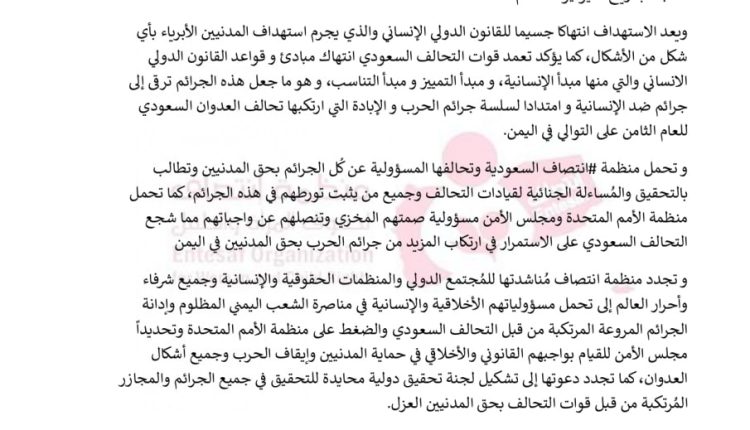 و تجدد منظمة انتصاف مُناشدتها للمُجتمع الدولي والمنظمات الحقوقية والإنسانية وجميع شرفاء وأحرار العالم إلى تحمل مسؤولياتهم الأخلاقية والإنسانية في مناصرة الشعب اليمني المظلوم وإدانة الجرائم المروعة المرتكبة من قبل التحالف السعودي والضغط على منظمة الأمم المتحدة وتحديداً مجلس الأمن للقيام بواجبهم القانوني والأخلاقي في حماية المدنيين وإيقاف الحرب وجميع أشكال العدوان، كما تجدد دعوتها إلى تشكيل لجنة تحقيق دولية محايدة للتحقيق في جميع الجرائم والمجازر المُرتكبة من قبل قوات التحالف بحق المدنيين العزل.