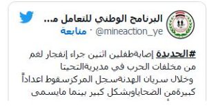 وأكد البرنامج التنفيذي للتعامل مع الالغام في تغريدة على ” تويتر ” تسجيل أعداداً كبيرة من الضحايا خلال سريان الهدنة .. مشيراً الى ان ما يسمى خلية الأجلاء والعمليات الإنسانية التابعة للتحالف تمنع الأمم المتحدة من شراء الأجهزة لتطهير القنابل العنقودية والألغام في اليمن .