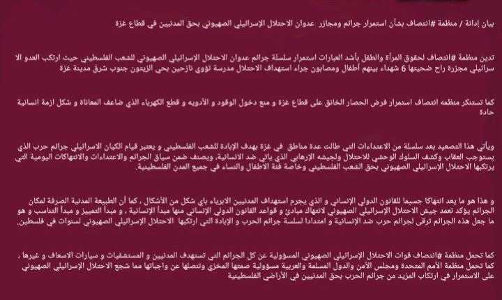 بيان إدانة / منظمة #انتصاف بشأن استمرار جرائم ومجازر  عدوان الاحتلال الإسرائيلي الصهيوني بحق المدنيين في قطاع غزة