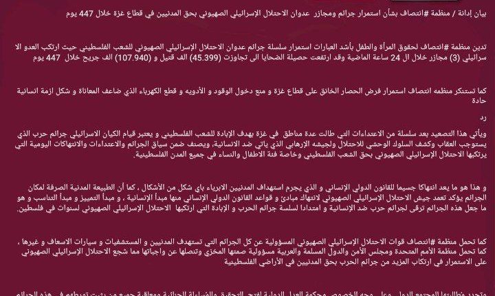 بيان إدانة / منظمة #انتصاف بشأن استمرار جرائم ومجازر عدوان الاحتلال الإسرائيلي الصهيوني بحق المدنيين في قطاع غزة خلال 447 يوم