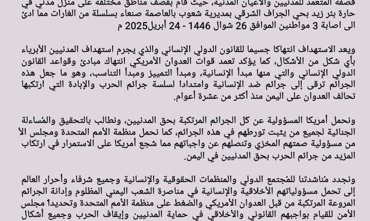 ندين ونستنكر بأشد العبارات استمرار جرائم العدوان الأمريكي بحق الشعب اليمني من خلال قصفه المتعمد للمدنيين والأعيان المدنية، حيث قام بقصف مناطق مختلفة على منزل مدني في حارة بئر زيد بحي الجراف الشرقي بمديرية شعوب بالعاصمة صنعاء بسلسلة من الغارات مما ادئ الى اصابة 3 مواطنين الموافق 26 شوال 1446 – 24 أبريل 2025م