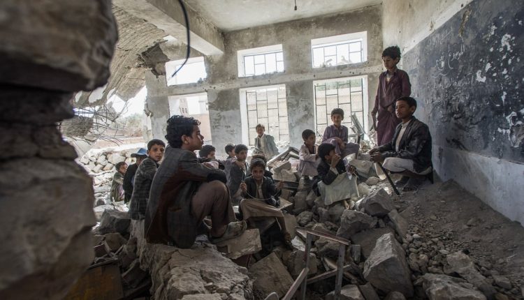 Children sit in a classroom at Aal Okab school in the city of Sa’ada in 2017. After the school was destroyed in 2015, classes moved to tents given by Unicef. With many schools destroyed since the war began in 2015, more than four million children have had their education disrupted.