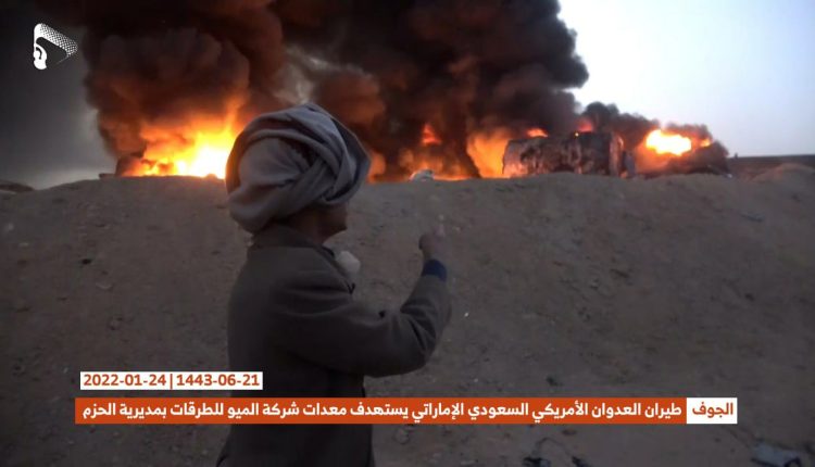 The crime of aggression warplanes targeting one of the equipment of the Mio Roads Company in the Al Hazm district in Al-Jawf.