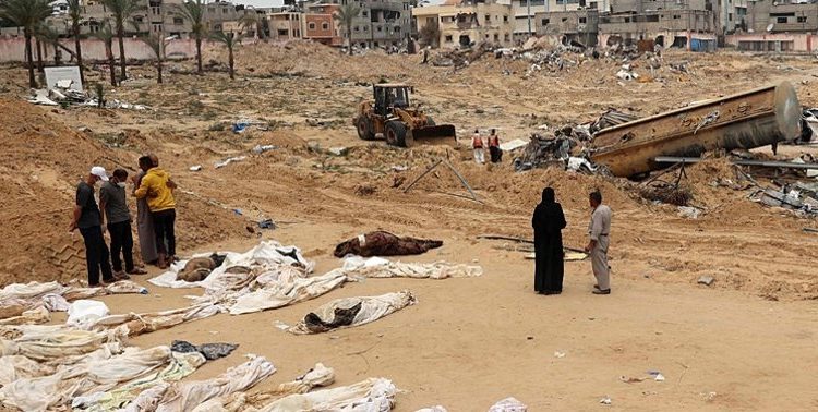 Al-Mughayer also noted that “the hands of some bodies were found bound with plastic restraints and corpses were wearing white robes used by the Israeli army as clothes for detainees in Nasser Hospital, with marks of gunshot wounds to the head, raising suspicions of their execution and field liquidation.”