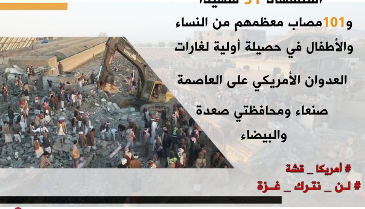 The organization condemns the continued crimes of the US-British aggression coalition against the Yemeni people. The coalition has bombed civilians and civilian objects in several Yemeni cities (Sana’a, Sa’ada, and Al Bayda), resulting in the deaths of 31 people and the injury of 101 others, most of whom were women and children, according to a preliminary toll.