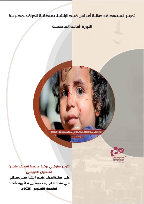 Entesaf Organization for Women and Children’s Rights issued a human rights report titled “Report on Targeting a Wedding Hall Under Construction in the Al-Jarraf Area, Al-Thawra District, Sana’a.” The report addresses the crime of the coalition’s airstrike on a wedding hall under construction in a residential neighborhood in the Al-Jarraf area, Al-Thawra District, Sana’a, which killed civilians, including women and children, on March 19, 2025.