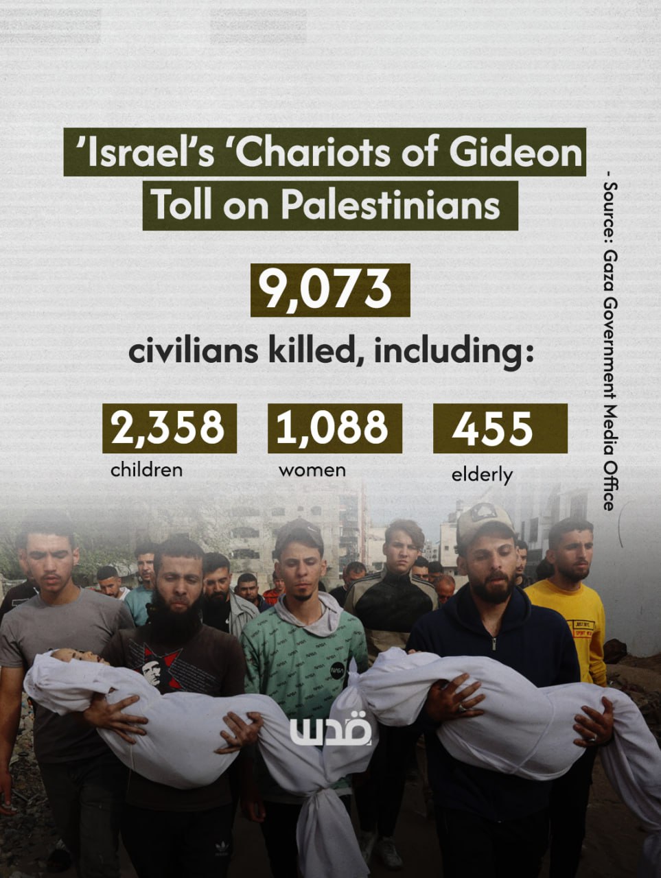 The Government Media Office in Gaza announced that Israeli forces committed horrific massacres during the “Chariots of Gideon” operation, resulting in the killing of 9,073 civilians and the injury of more than 36,900 others with varying degrees of wounds, most of them women and children.